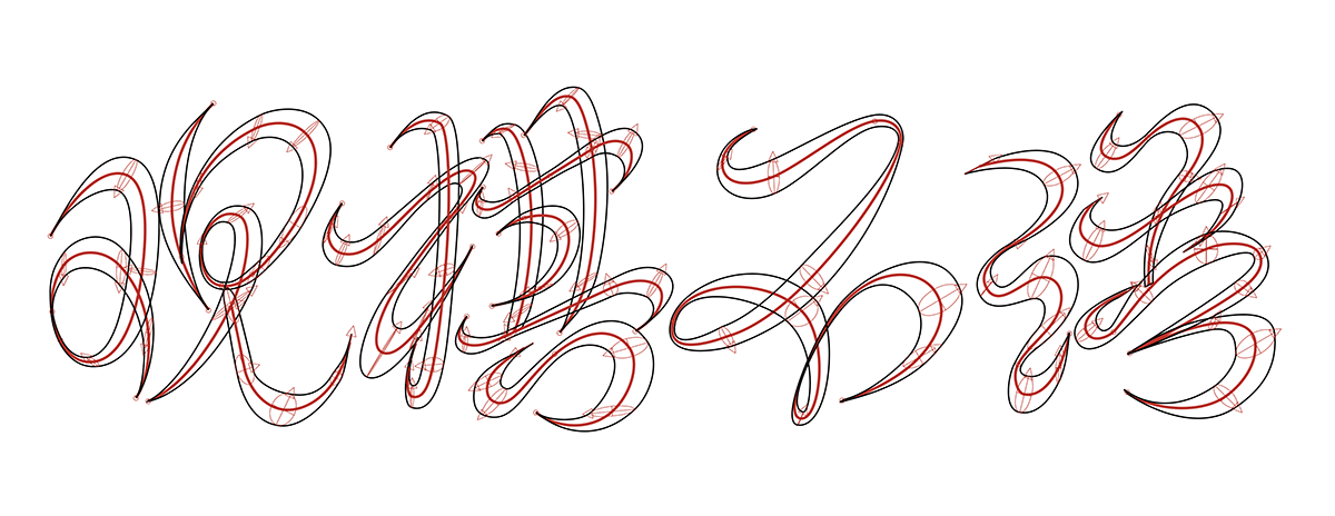 好像打破次元的这种思考模式也带给我很大的趣味感,一些细小的连笔也可以以更真实自然的方式自动生成,在后续调整完笔画形态后也能回过头来对骨架进行进一步修改,超级方便。