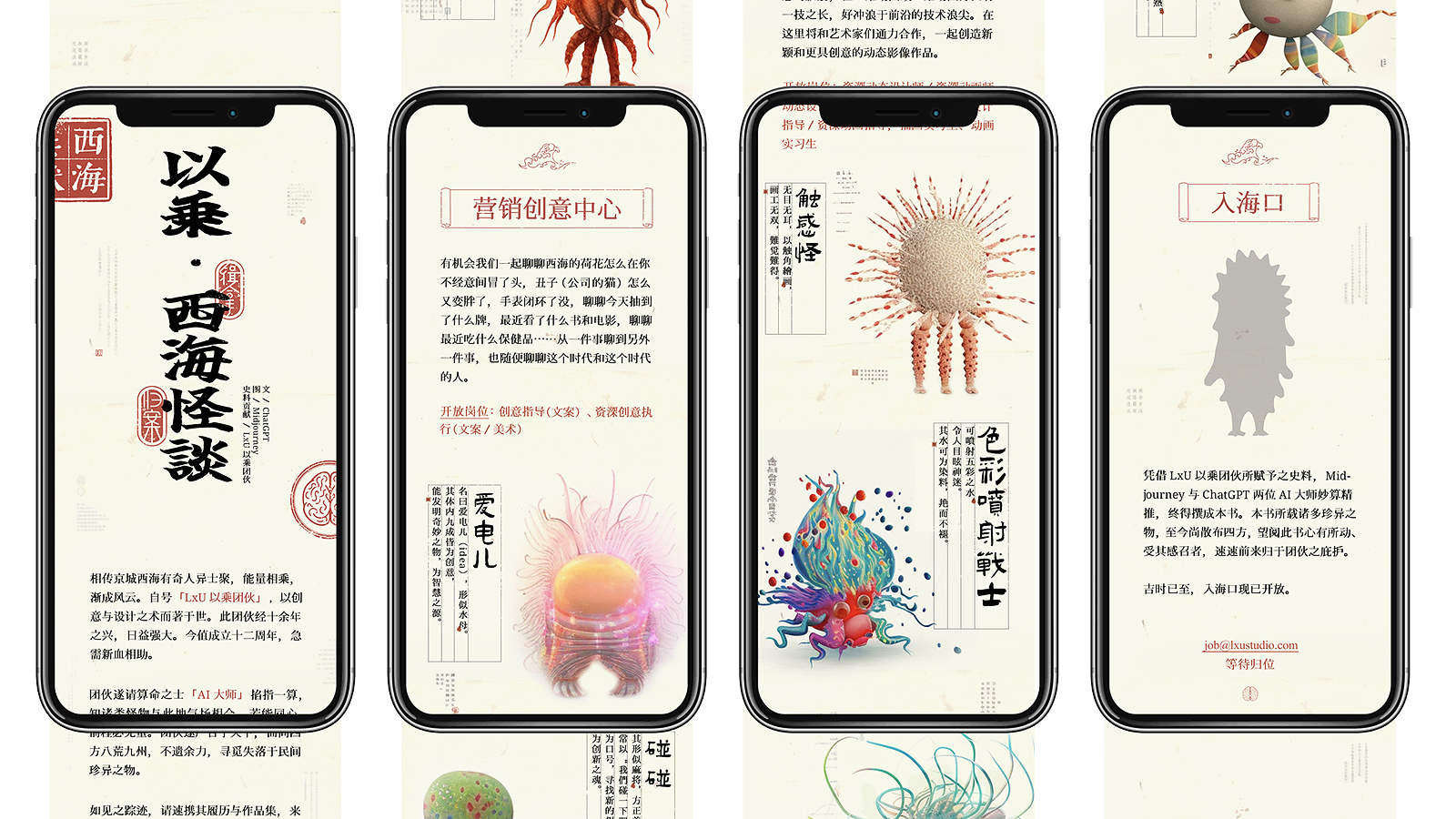 聚焦于团伙热切的招聘需求,我们运用 AI 工具 ChatGPT 和 Midjourney ,虚构出一本中式古籍《以乘·西海怪谈》,为想象中那些神通广大、各具特色的潜在团伙们赋予珍奇怪物的形象,向外寻找遗落民间珍贵的它们,搬进西海一起造浪!(戳这里阅读原文)