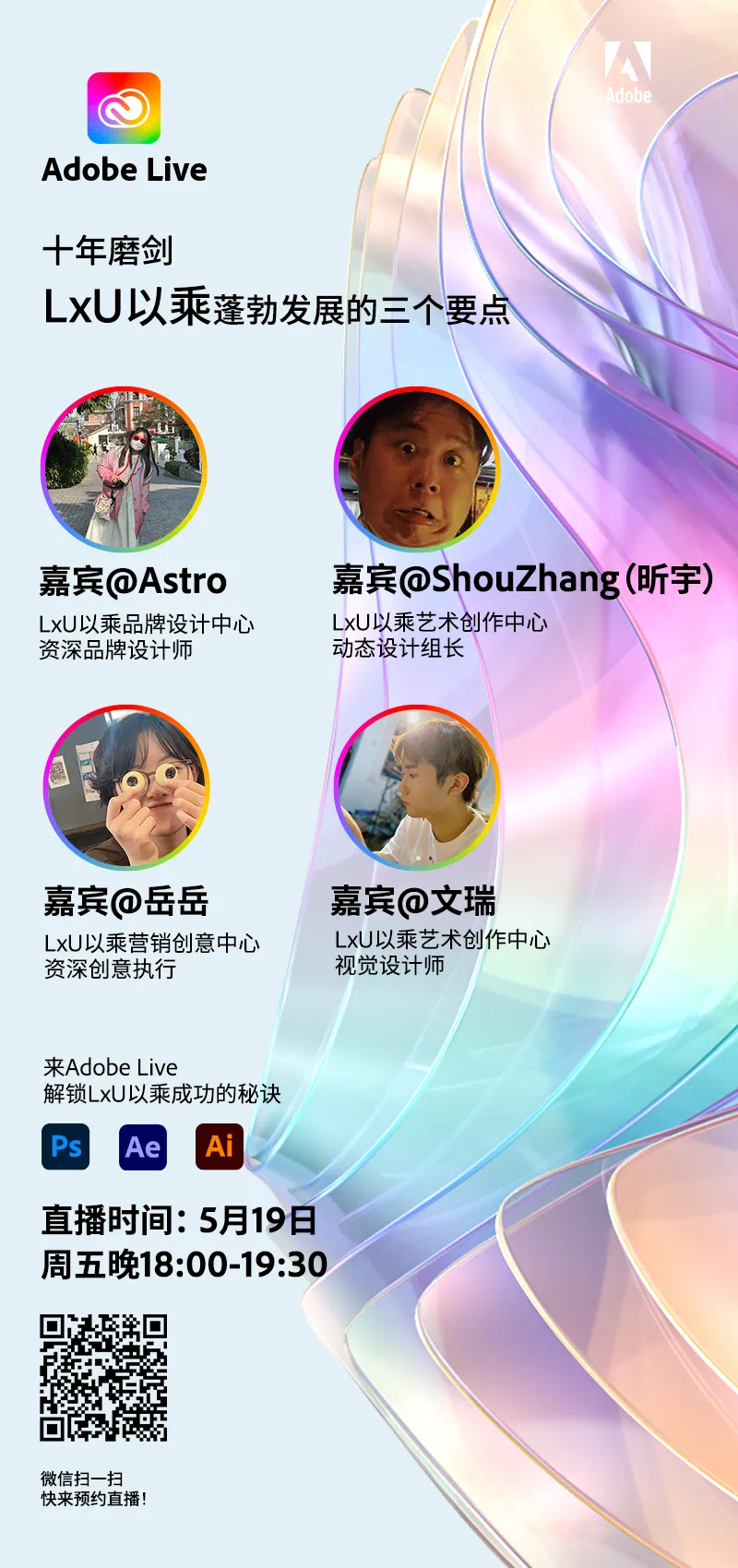 Adobe Live 首次走出影棚,将摄像机架在 LxU 以乘办公室来探店。而我们也将潜心修为十余年的独门秘诀「乘法效应」工作流在直播中公之于众~