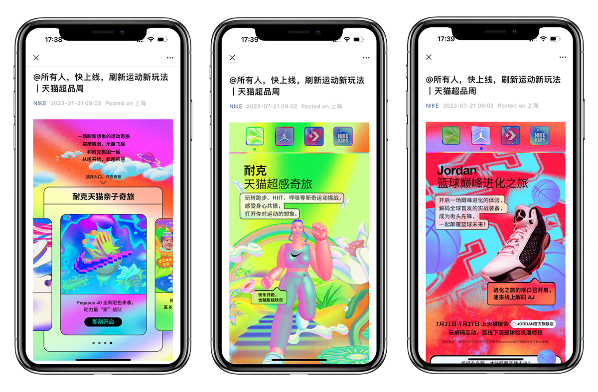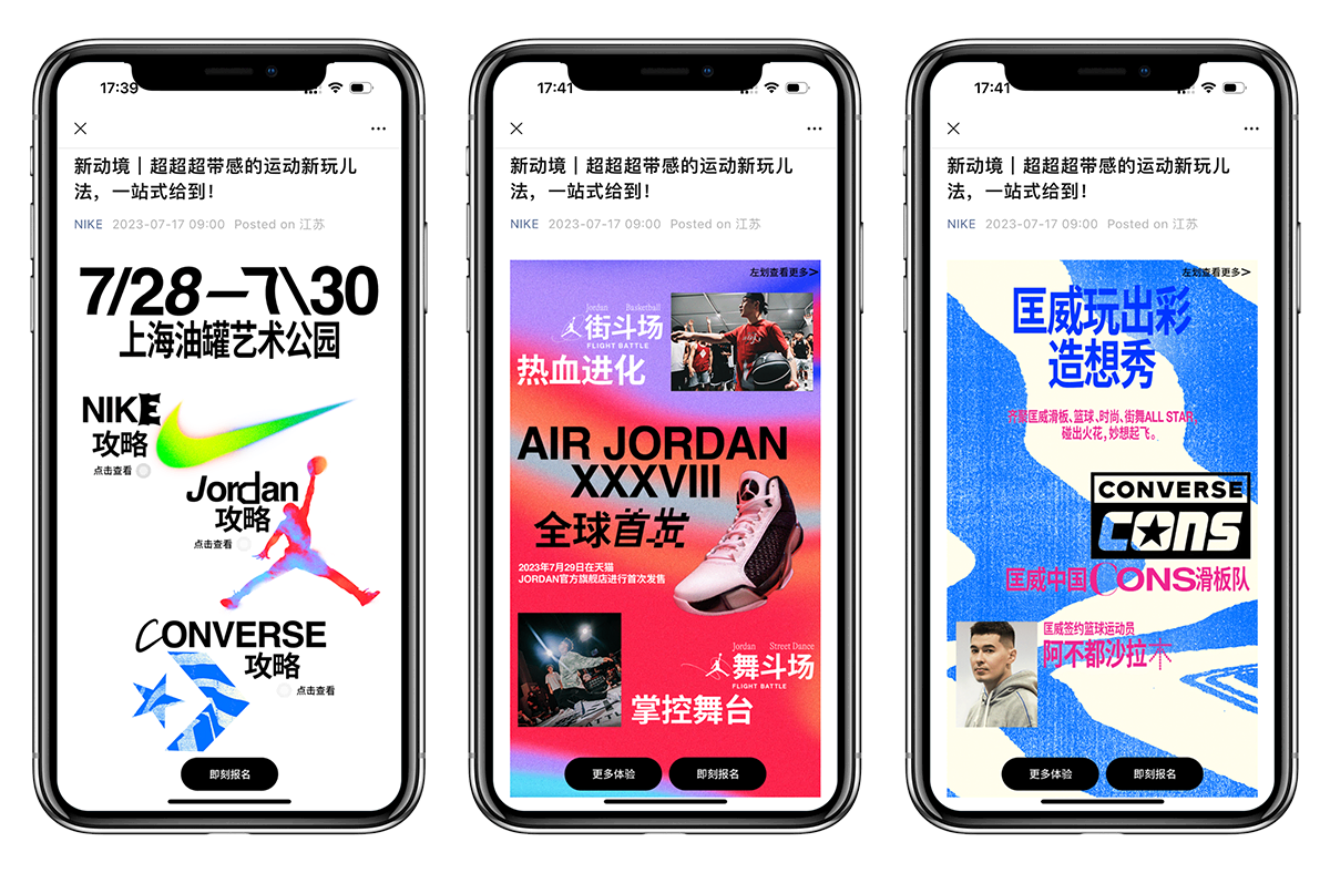 在天猫超级品牌周之际,耐克集团携旗下品牌开启「新动境」超感奇旅,玩新趣互动挑战。在上海油罐艺术公园线下组局,一站刷新各种运动玩法。我们则包揽了这场超超超带感大 party 的线下体验文案以及微信文章相关传播内容。