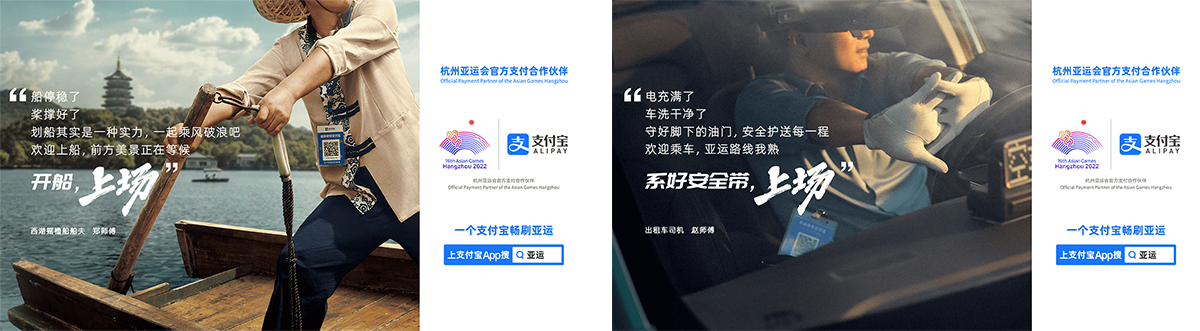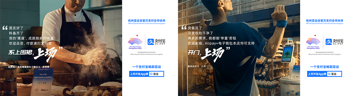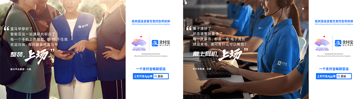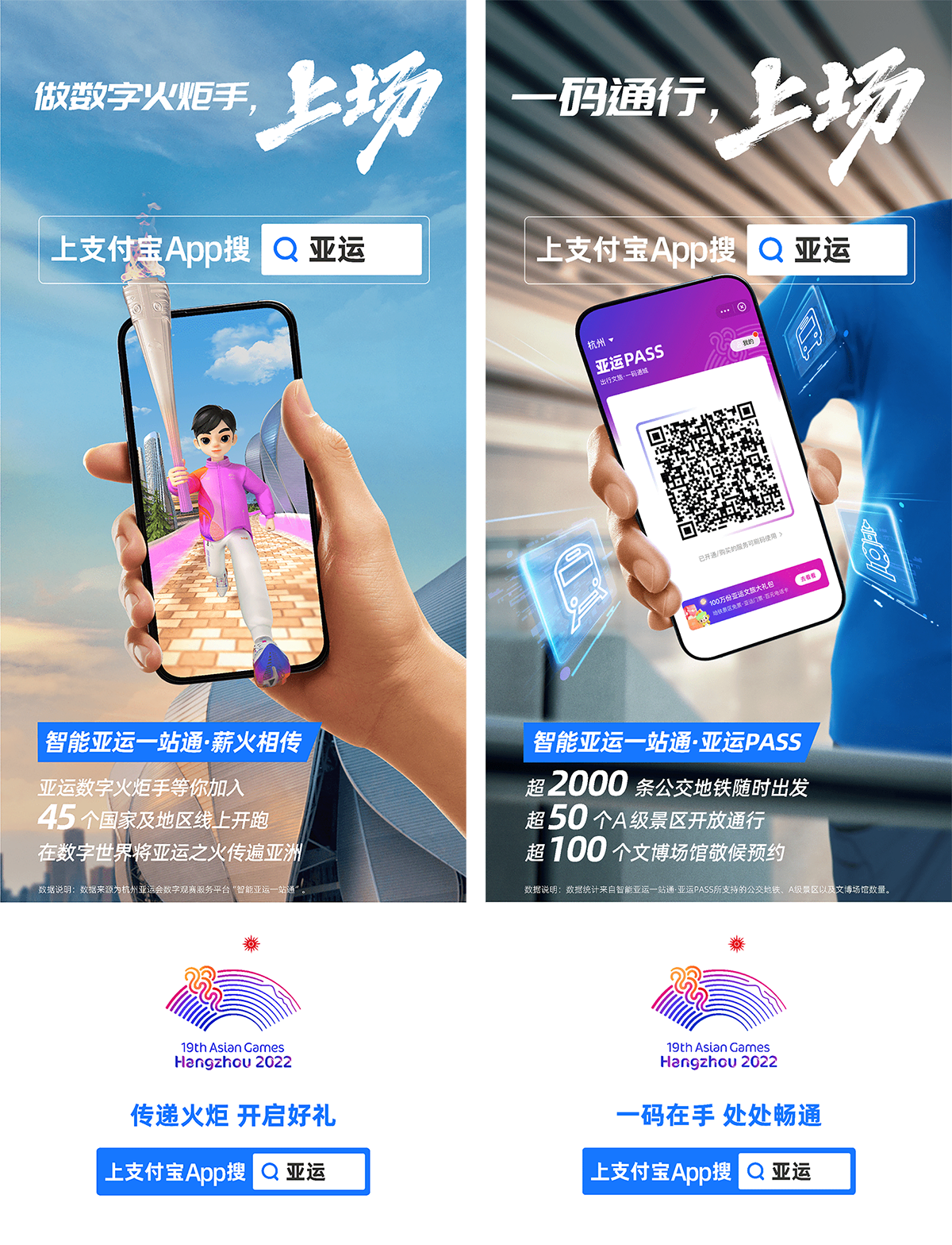 长时间的筹备,只为亚运那一刻的绽放。我们提出「上场!」的创意概念,指代「准备」许久的运动员、工作组人员、杭州市民、蚂蚁集团此刻即将迎来上场,也表达蚂蚁集团和大家满怀信心、只待检阅的态度。通过两组海报从「产品」和「品牌」两个纬度做视觉呈现。