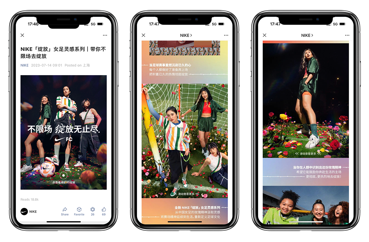 在不久前的女足世界杯期间,我们有幸为 Nike 打造了一场以中国女足为灵感的 Campaign「不限场 绽放无止境」。从中国女足的玫瑰精神中汲取灵感,将赛场精神延续到生活。通过系列设计与女足国家队球衣搭配,全然绽放本色,也大胆展现锋芒。