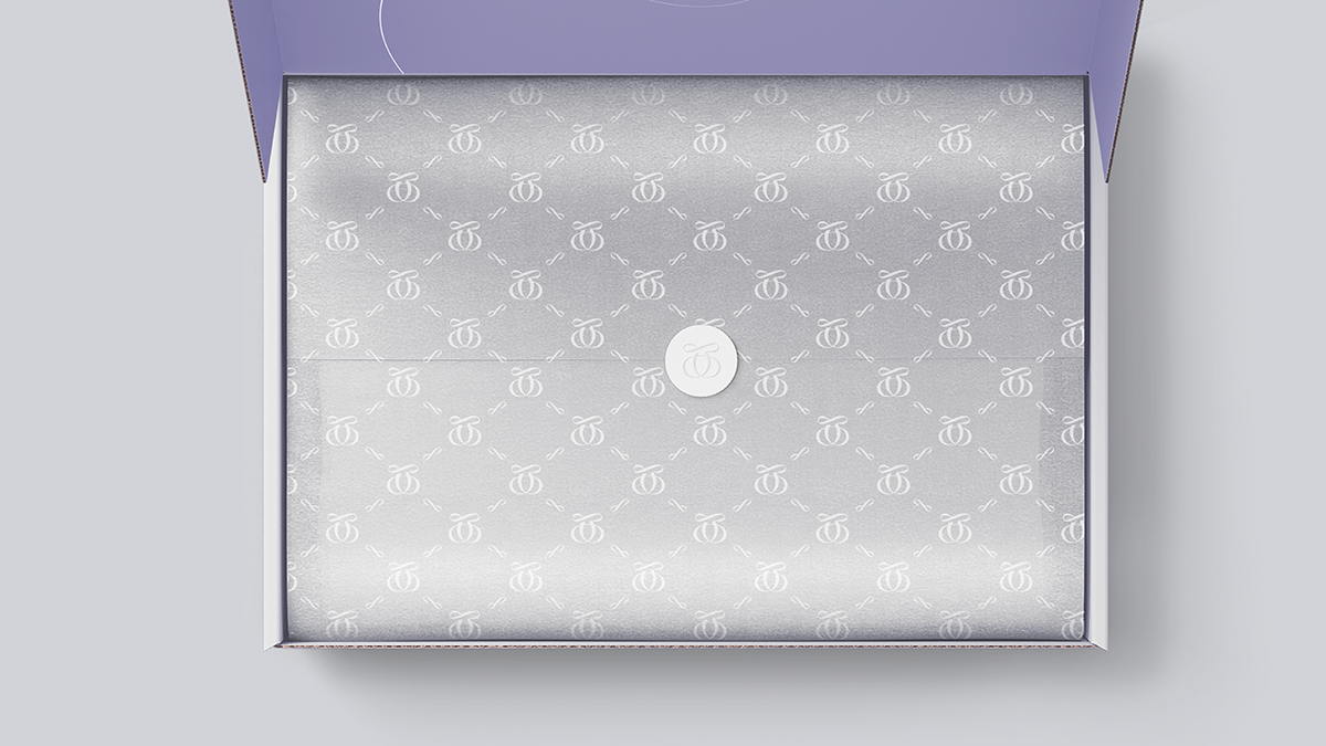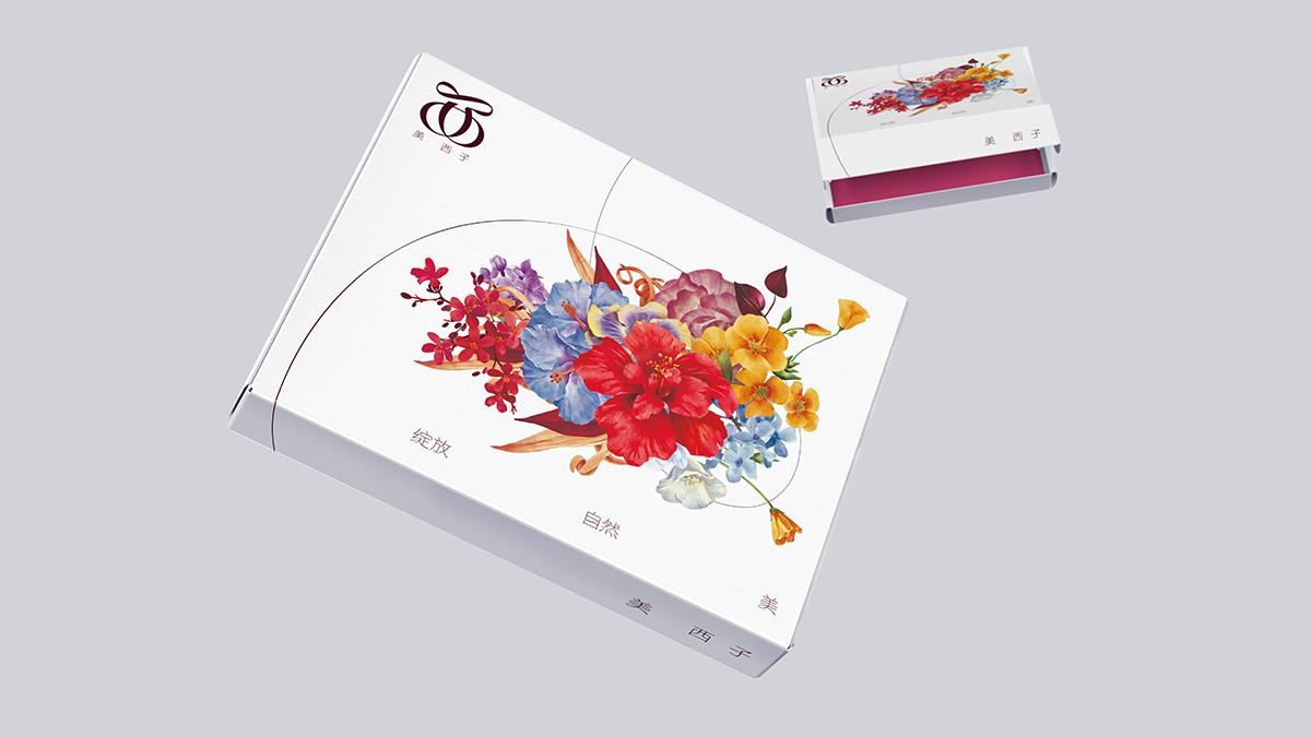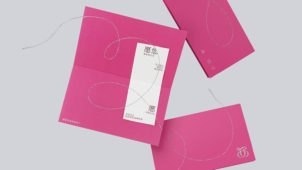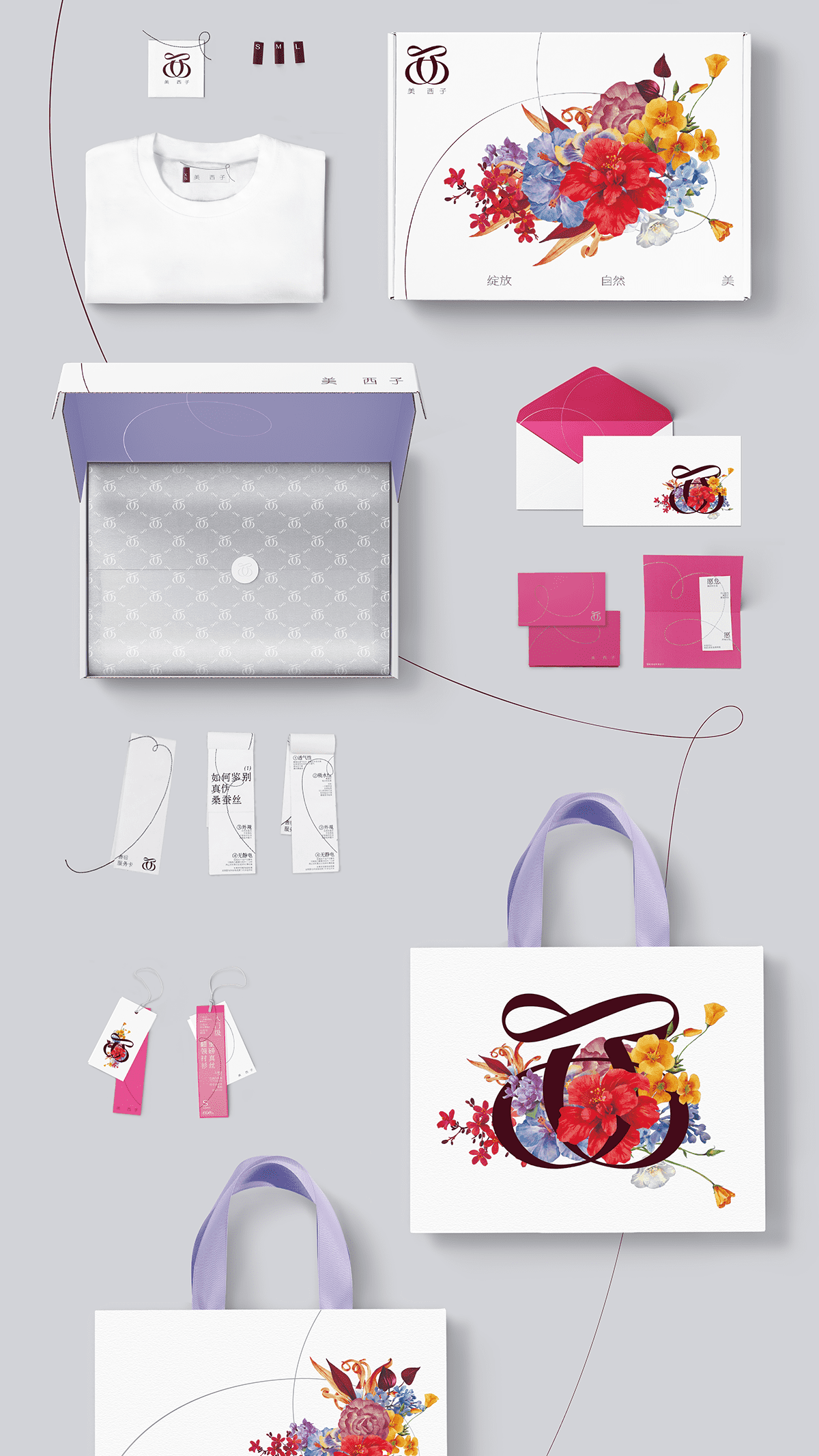 自由灵动的曲线也暗含「穿针引线」的直观联想,与绽放多样的花束相配合,呈现突破绽放的感受,延展在包装吊牌、水洗唛等等物料中,整体表达出30-40+女性热烈自由不设限的状态。