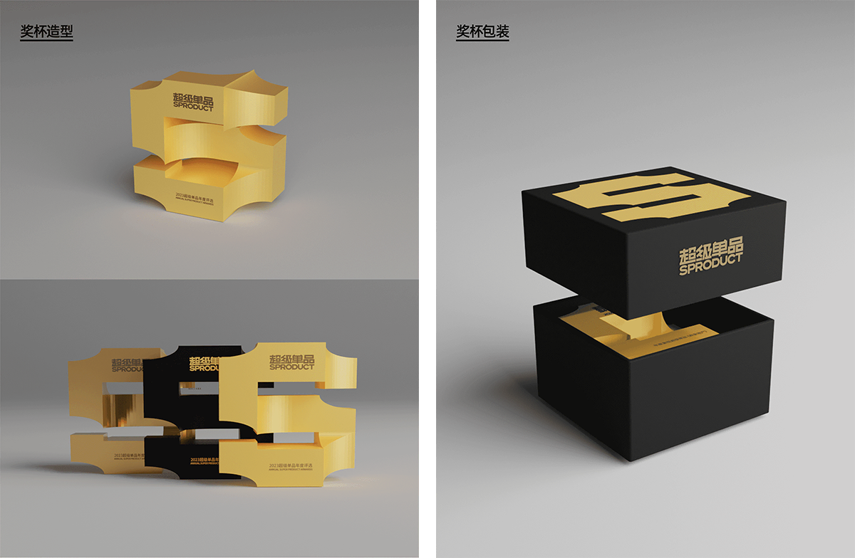 奖杯设计延续「超级单品」的视觉统一性,将标志平面图形转换为带有前后空间变化的三维结构。造型上采用螺旋上升形态,体现助力品牌成长、产品价值上升的价值认同。