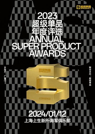 在动态海报设计中,强调品牌性并突出奖项首次评选,采用奖项名称和奖杯作为海报的视觉重心,体现以「超级」、自信的姿态强势登场。整体呈现出简洁而统一的视觉印象。