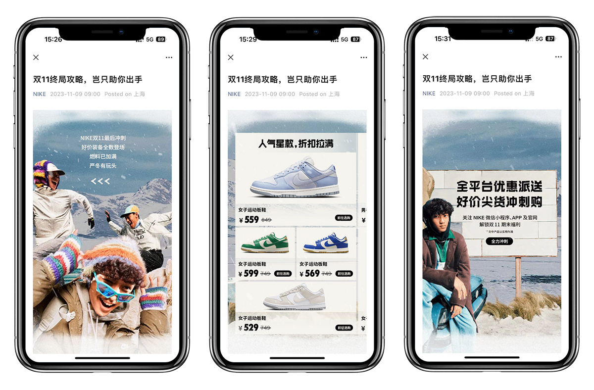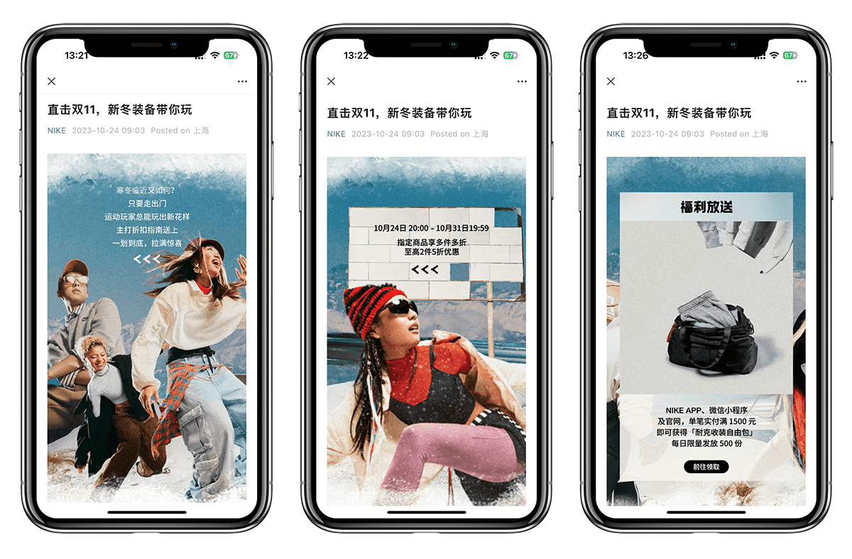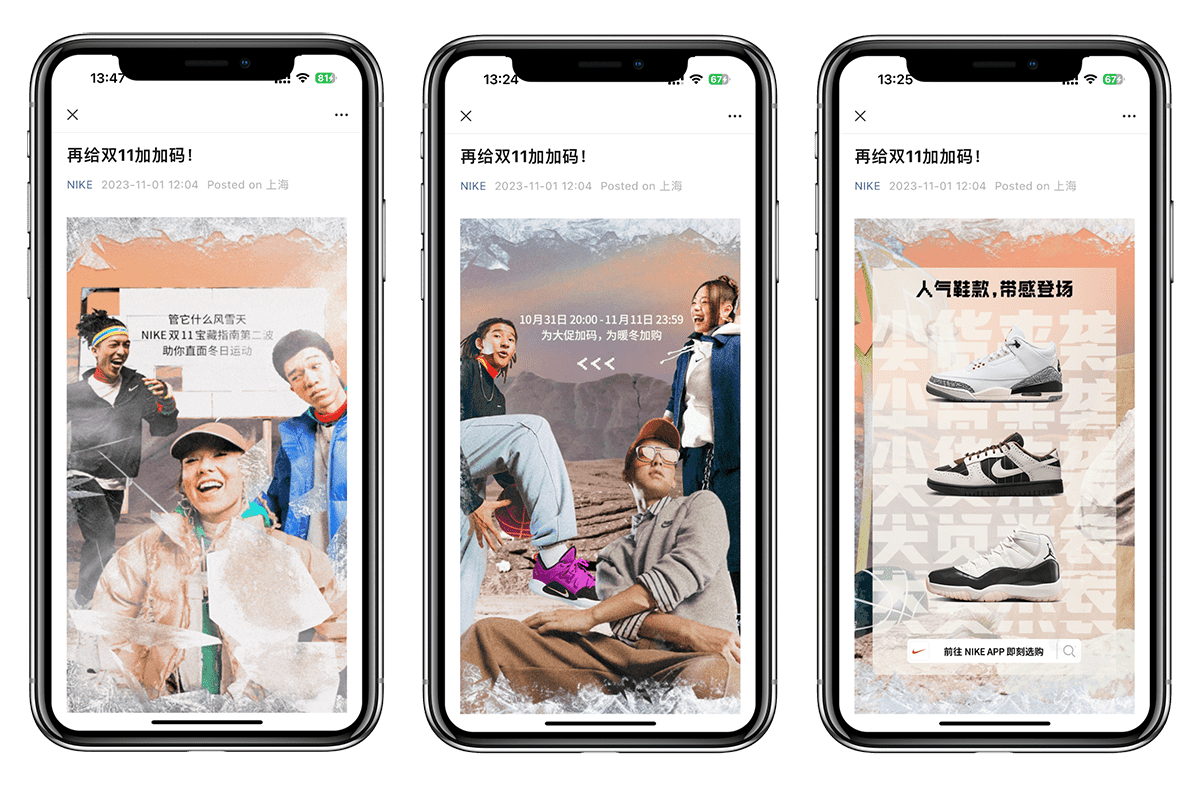 我们为 Nike 双 11 打造社会化营销活动。通过一系列交互图文传播,接连送上三波主打折扣指南。结合寒冬氛围,在视觉上模拟风雪天的效果,助你突破天气限制,用 Nike 尖货加持,直面冬日运动!