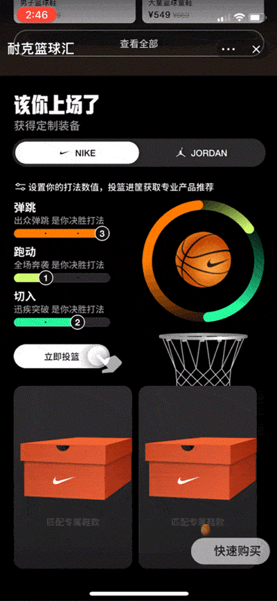 围绕「时刻在场」的创意概念,为用户打造一个沉浸式的篮球购物环境。通过融入球迷熟悉并喜爱的元素,丰富用户的在场体验感,如「翻转球星卡片」查看球星产品、「玩投篮游戏」获得实战鞋款推荐等等,吸引更多篮球产品消费者的关注。