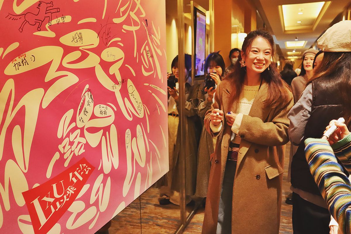 入场前,大伙笑声连接着笑声,热热闹闹签个到。