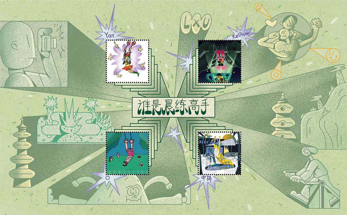 LxU 提交的插画作品《谁是晨练高手》描绘了常常在西海附近健身小广场出没的神秘晨练爱好者。他们在小广场上尽情施展满身才艺,轻松驾驭各类健身器材,偶尔的眼神交汇透露出高手过招的杀气。