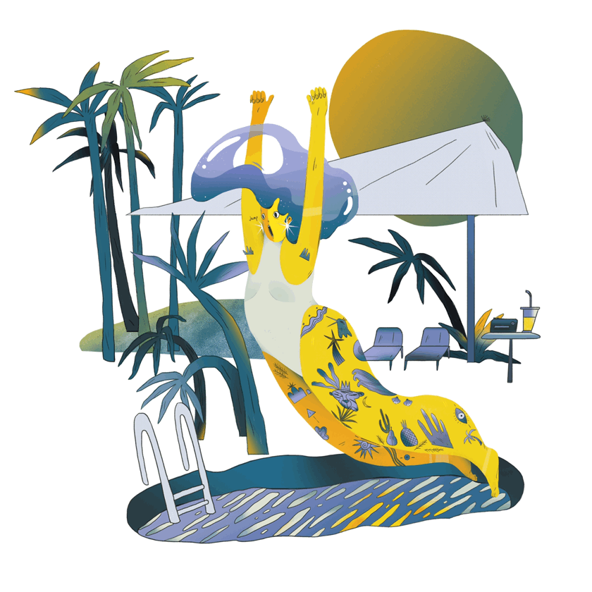 路过的我们悄悄用插画记录下这些身影,在邮票设计的二次创作中还尝试营造空间感,加入了更多西海附近的有趣景观。