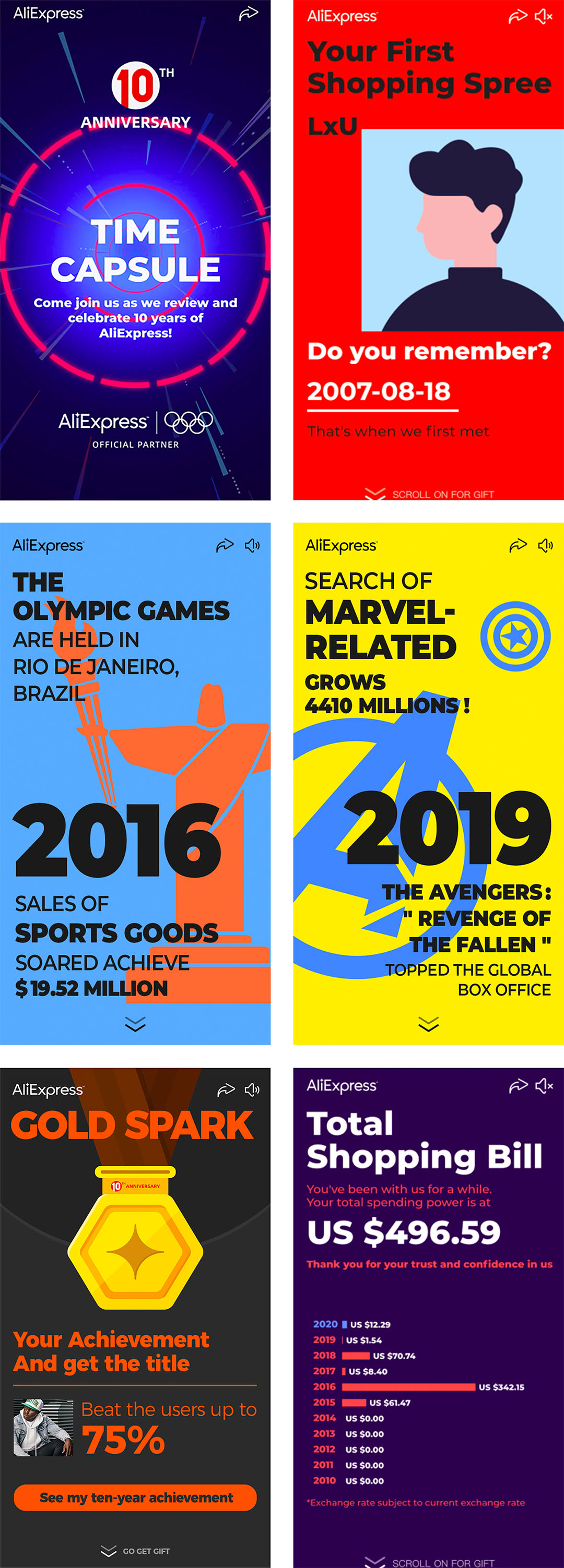 为了庆祝 AliExpress 十周年,我们打造了一个 “时光隧道” ,将十年间发生的大事集合于一支 H5 中,勾起全球用户的个人回忆与共同回忆。
