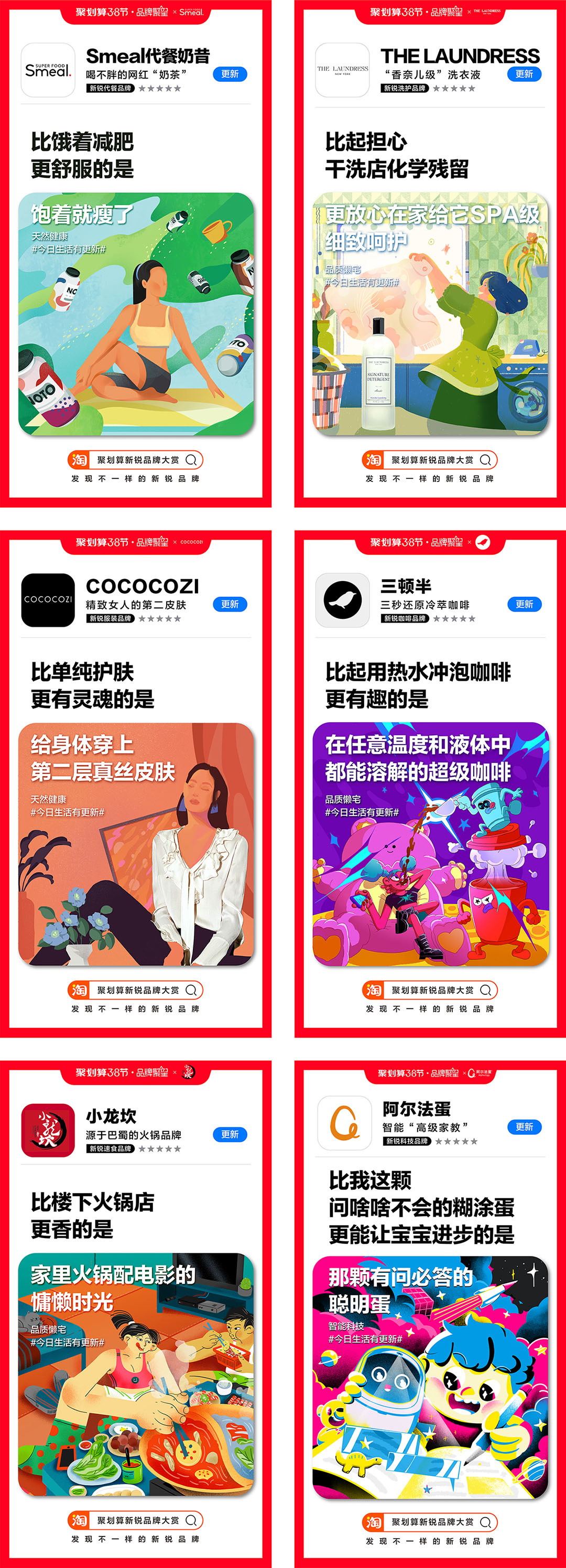 一组品牌海报以 #今日生活有更新# 为主题。基于对女性消费趋势的真实洞察,联合符合趋势的 100 家新锐品牌呈现。既为消费者提供符合心意的选择,也为新锐品牌创造发声渠道。